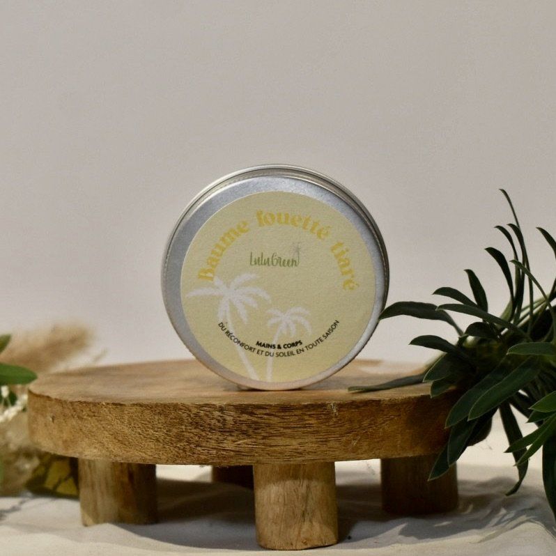 Découvrez notre baume fouetté Tiaré à la texture chantilly. Nourrit, apaise et répare la peau avec un parfum d'été envoûtant. Huile de coco et cire d'abeille bio. Format nomade.
