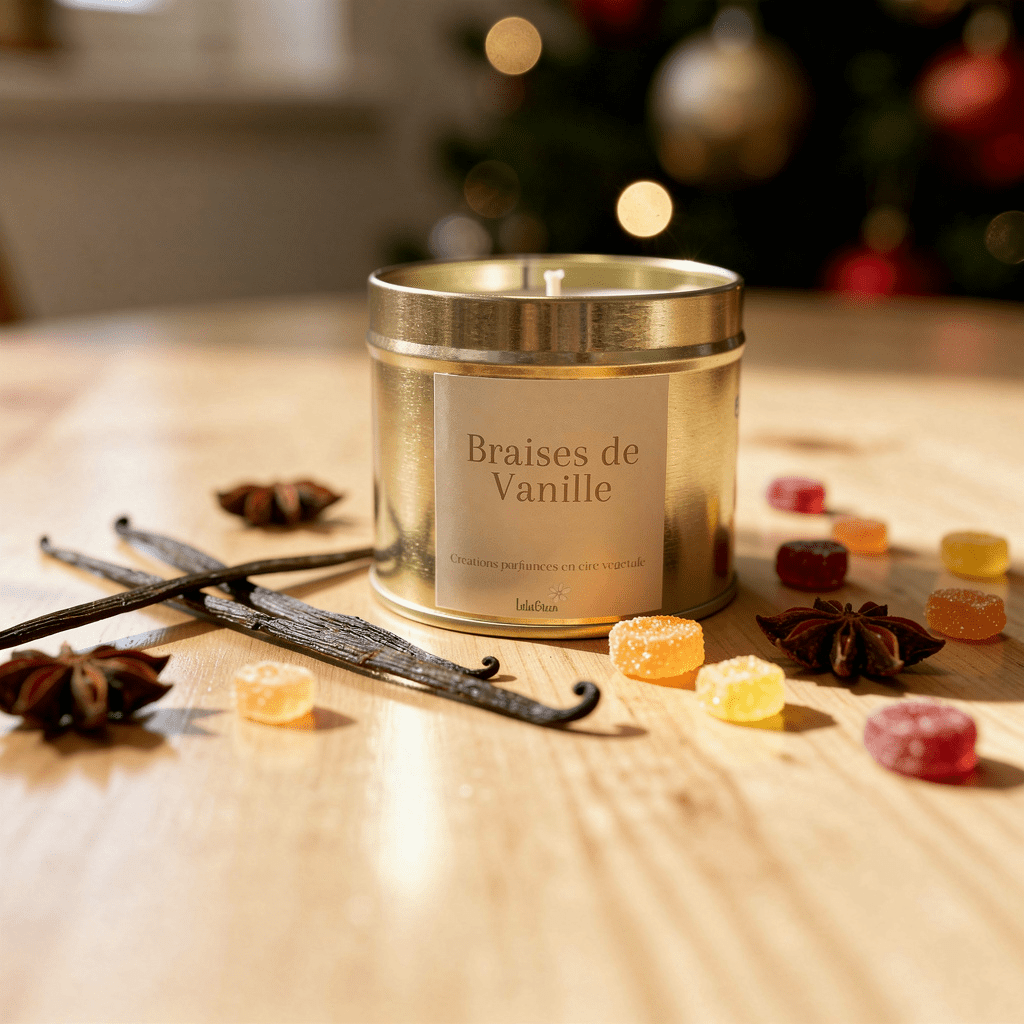 Bougie en cire végétale, aux notes vanillées, fumées, épicées parfaite pour un moment de détente avec un plaid bien chaud.