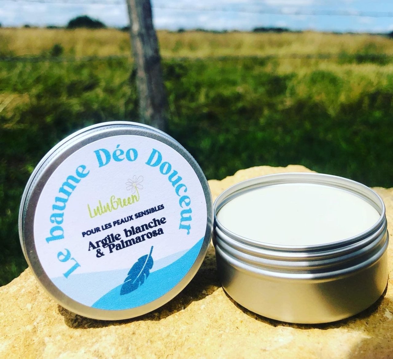 DEO DOUCEUR, baume à appliquer du bout des doigts. Sans bicarbonate et avec de l'huile essentielle de palmarès, il n'agresse pas la peau et protège des odeurs de transpiration toute la journée. Très économique, il dure longtemps (50 g).