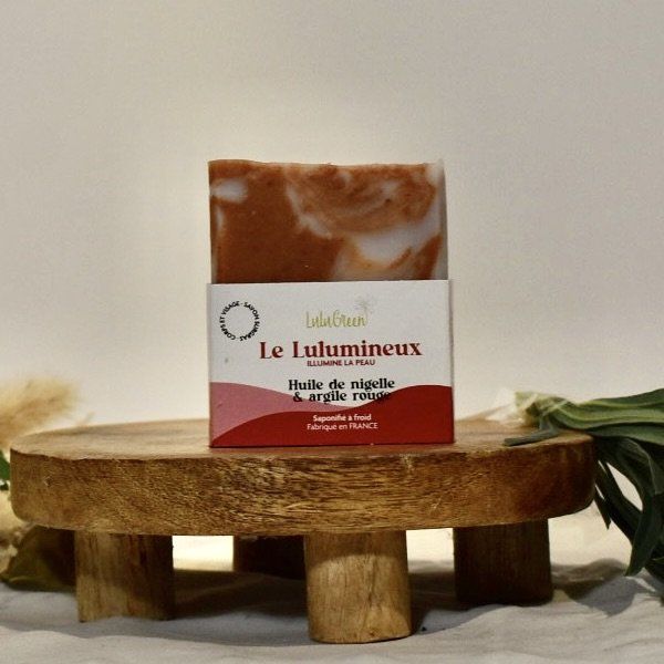 Découvrez notre savon visage Lulumineux, fabriqué à la main à Iguerande. Savon surgras bio qui et illumine le teint. Formule naturelle à l'huile de Nigelle et argile rouge.