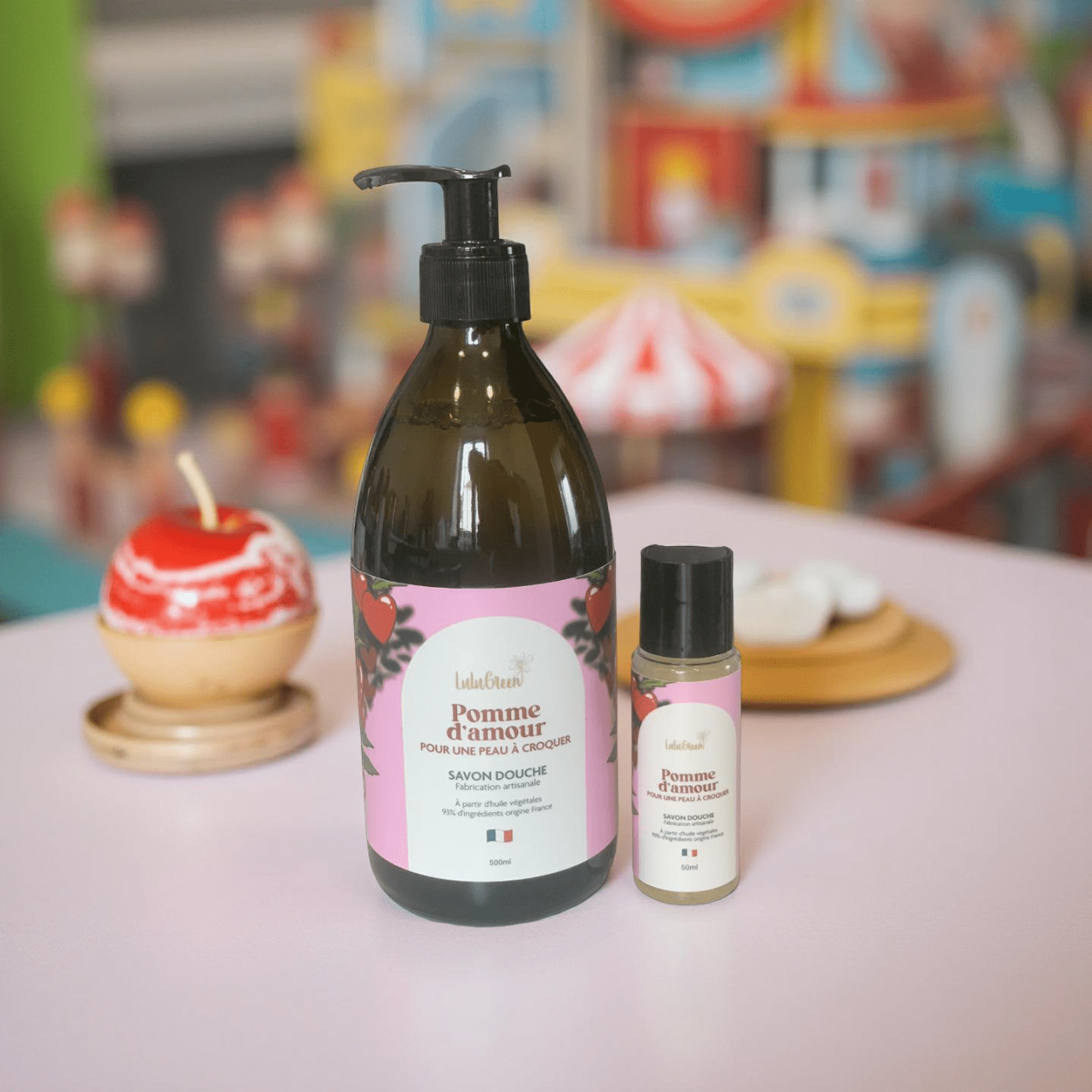 Découvrez le le savon douche Pomme d ‘amour signé Lulu Green Cosmétiques : un au parfum acidulé qui rappelle le bonbon Arlequin, formulé avec 93 % d’ingrédients français et des huiles végétales biologiques.